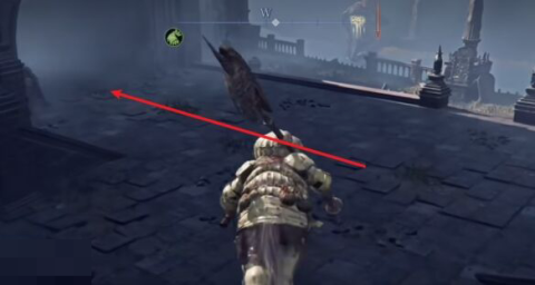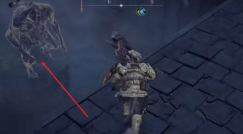 2、接着前往左侧的建筑,那里有一具骷髅兵并散发着光芒。进入这座建筑,跳入其中的洞口。