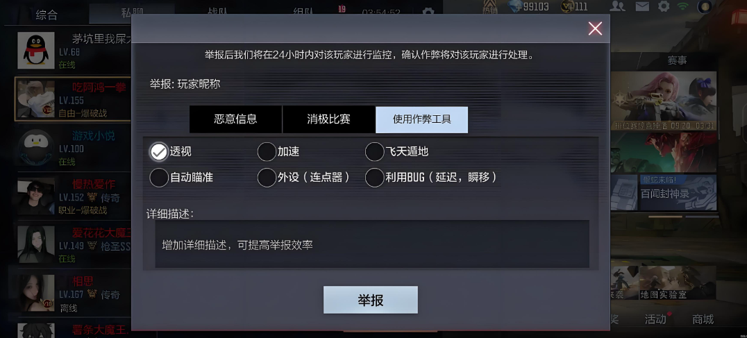 外挂行为的特殊举报流程对于最让人深恶痛绝的外挂行为,举报时需要格外注意证据的完整性。除了前面提到的实时录制视频外,还可以在游戏结束后保存完整录像,上传到官网接受绿色联盟的审判。 举报外挂时一定要提供录像、截图、服务器和ID等信息,证据越充分,处理速度越快。 但要提醒大家,如果举报外挂却无法提供确凿证据,系统可能会判定为恶意举报,导致你暂时无法使用举报功能。