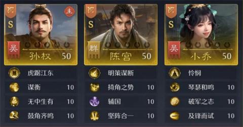 在辅修兵法的选择上,不妨参考以下组合:[雷霆、集气、善断]、[活气、奋主、固军],以及[守势、固阵、鲁钝]。这里,射手弓兵的选取是关键,而通过小乔和陈宫这两名辅助可以迅速恢复怒气,加速孙权主将技能的轮回,确保输出的持续性。这个阵容非常适合灵活的野战操作,无需集结即可发挥最大的优势。