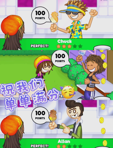 10、最后递给顾客,顾客会根据你的冰淇淋口味和装饰进行打分。高分意味着丰厚的小费。
