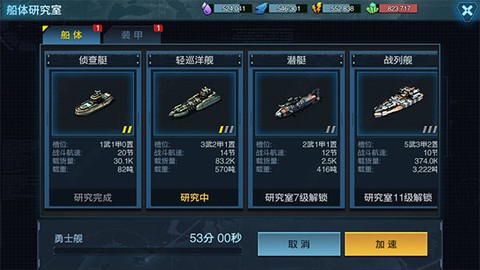 1. 船体研究室:可以研究解锁船体和装甲,为军舰建造提供搭配。高等级科技研究需要更多时间和资源,合理利用资源至关重要。